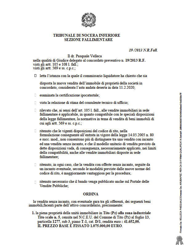 Concordato Preventivo n. 19/2013 del Tribunale di Nocera Inferiore |
