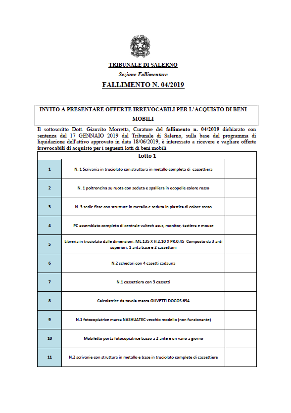 Fallimento n. 4/2019 del Tribunale di Salerno |