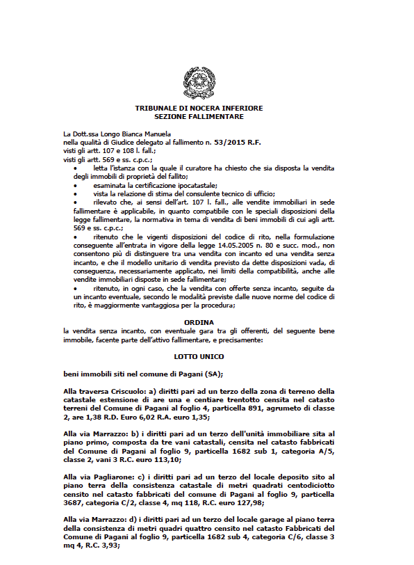 Fallimento n. 53/2015 R.F. del Tribunale di Nocera Inferiore |