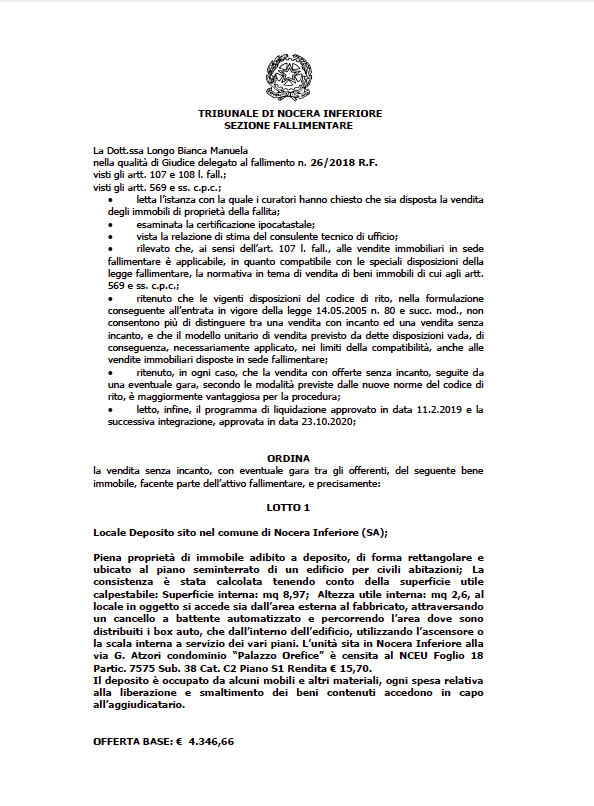 Fallimento n. 26/2018 R.F. del Tribunale di Nocera Inferiore |