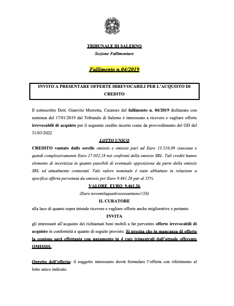 Fallimento n. 4/2019 del Tribunale di Salerno |
