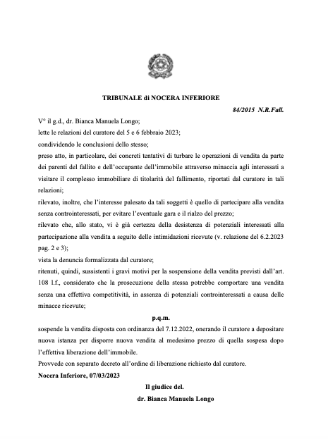 Fallimento n. 84/2015 del Tribunale di Nocera Inferiore |