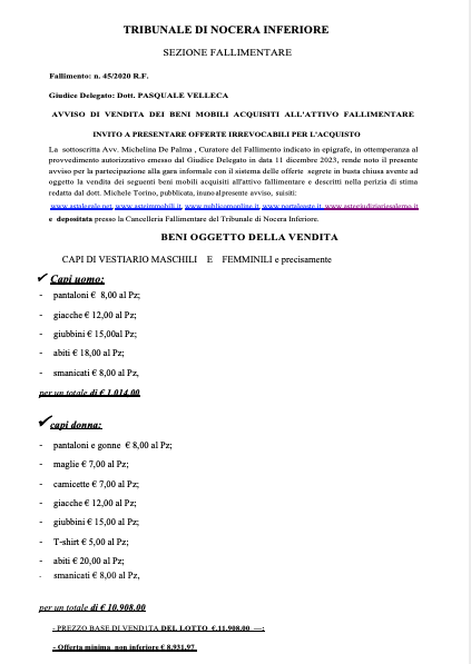 Fallimento n. 45/2020 R.F. del Tribunale di Nocera Inferiore